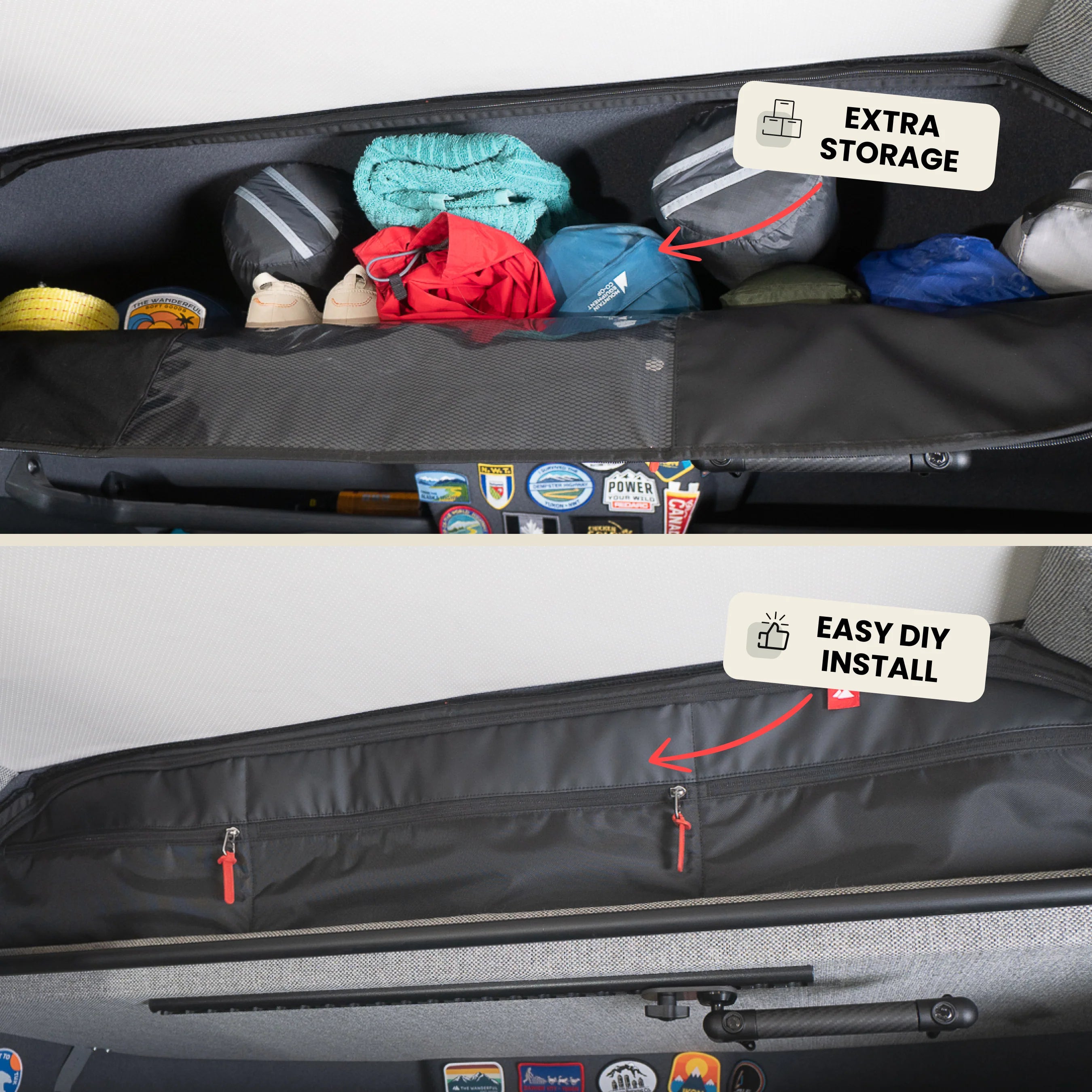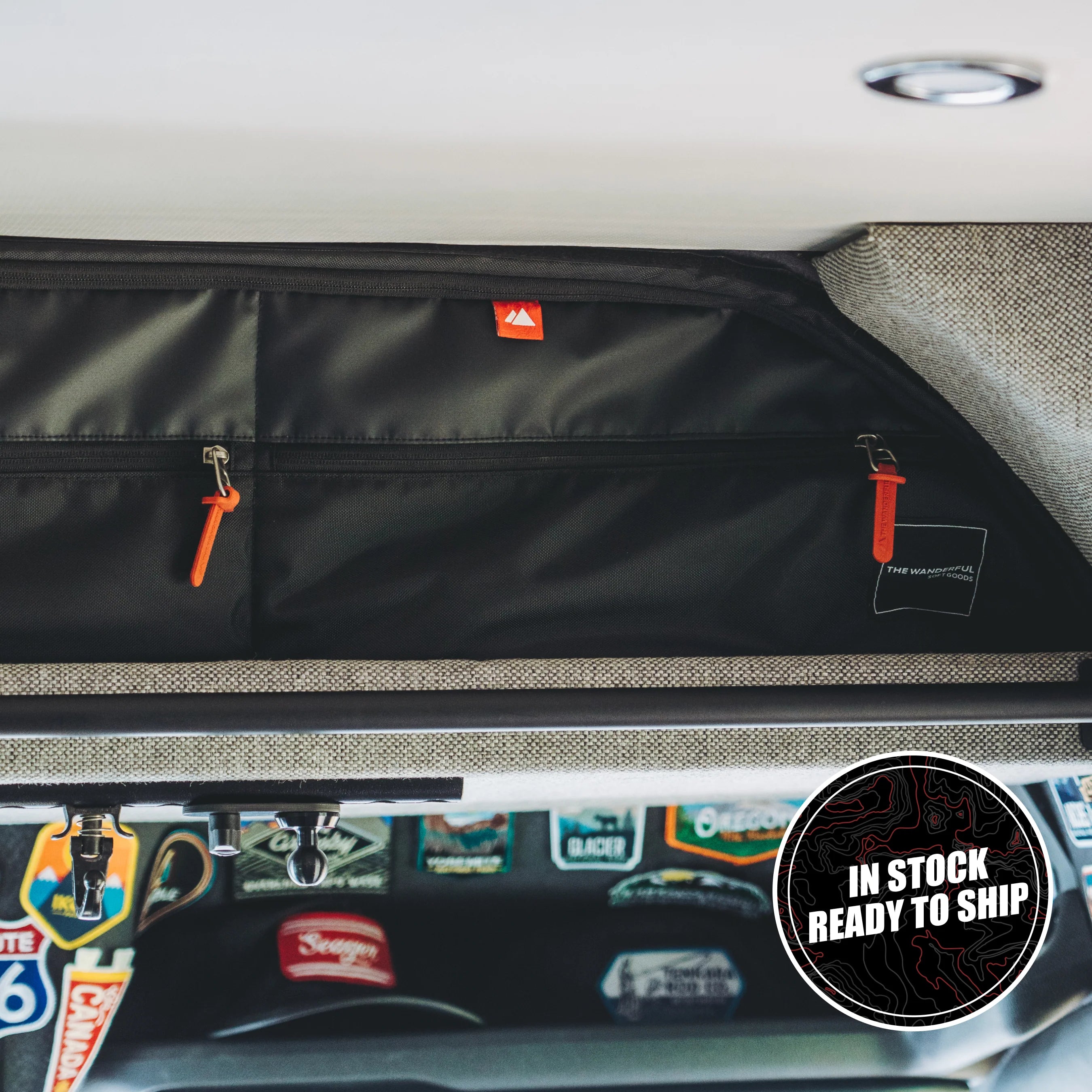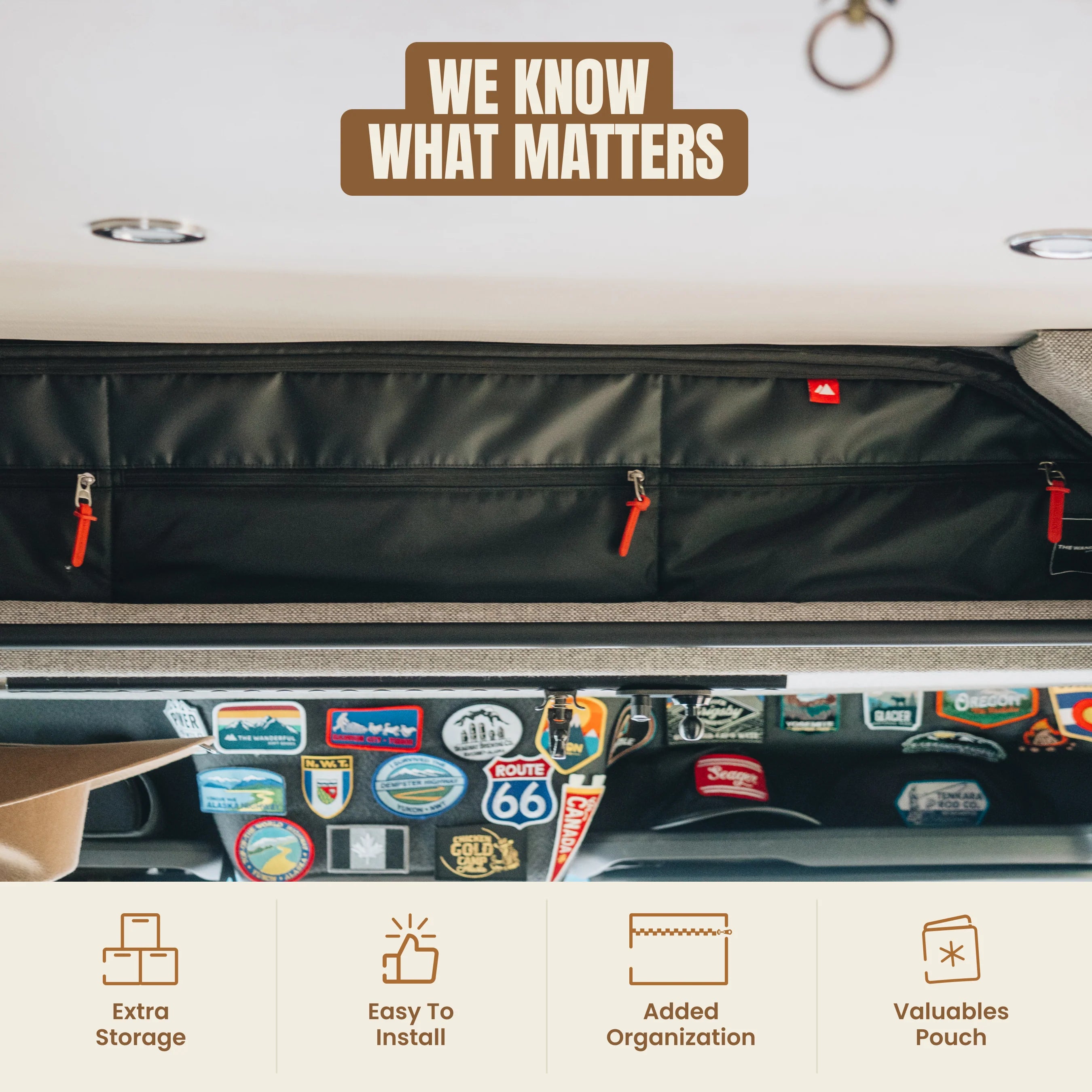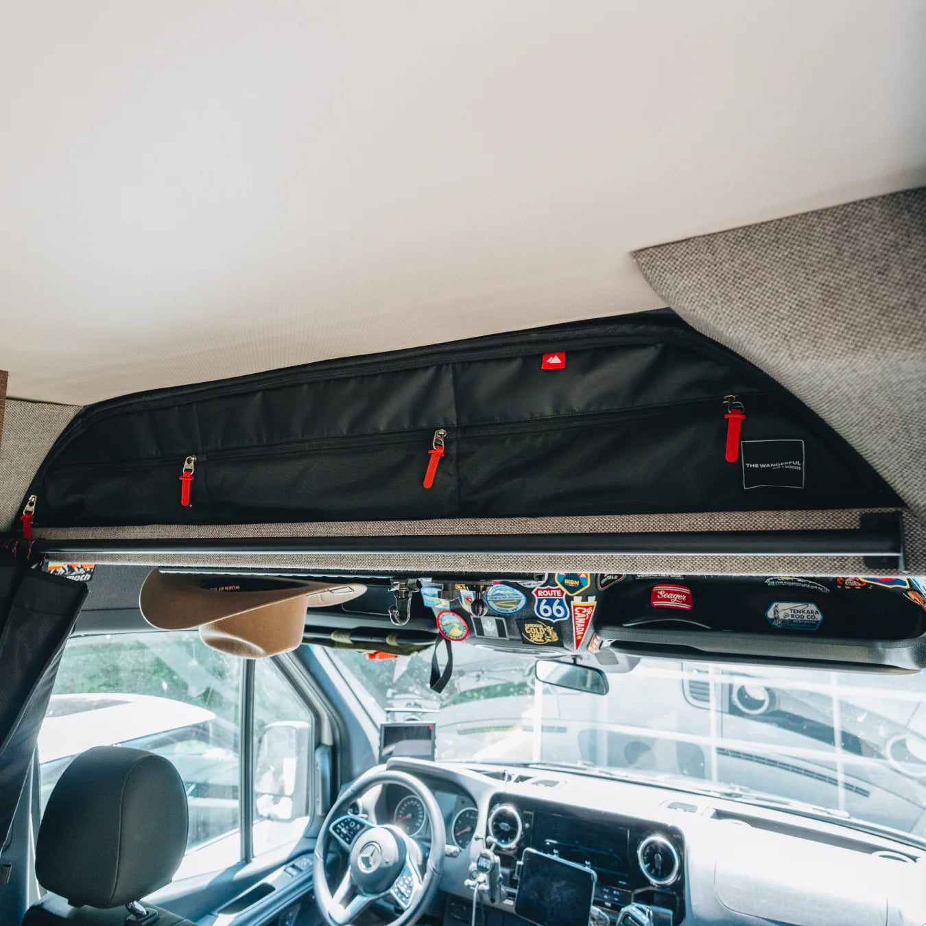 Don’t like clutter? Tired of things falling from your overhead shelf on those bumpy roads? Check out our Hideaway Headliner Shelf Cover! It secures your overhead storage in a snap and keeps your van looking tidy.