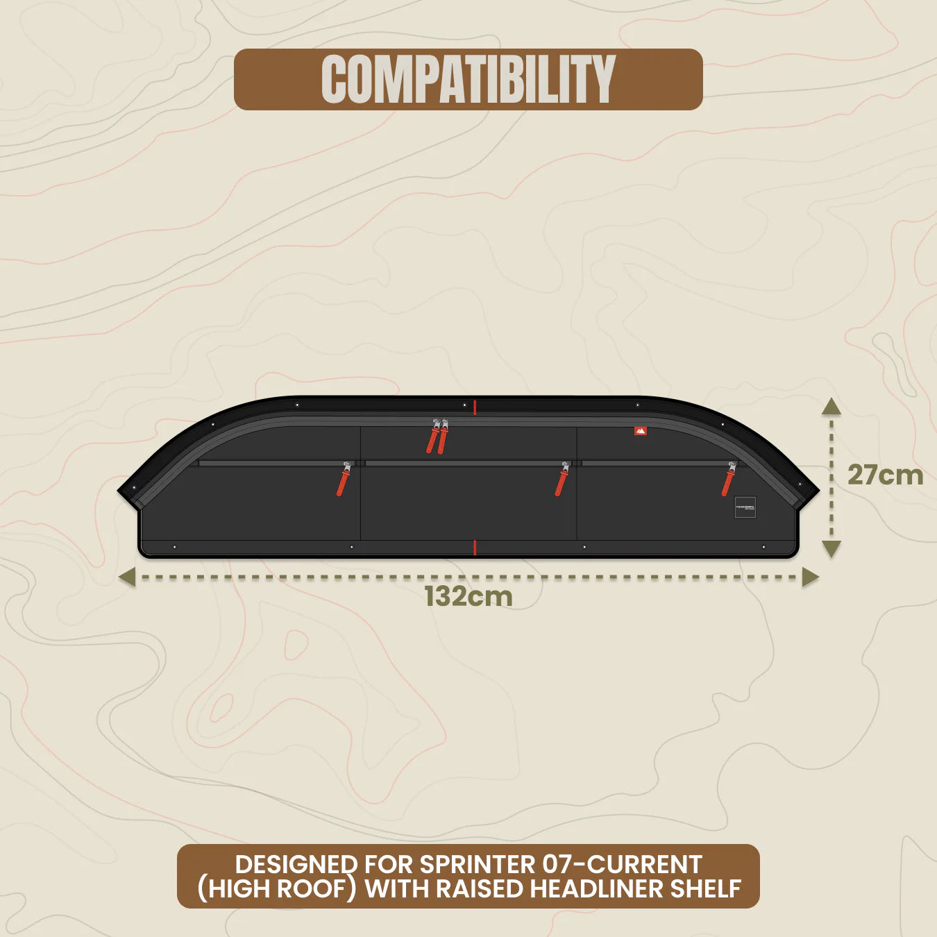 Our shelf optimizes the unused space above the driver and passenger seat for convenient, accessible storage, without compromising comfort of the interior living space